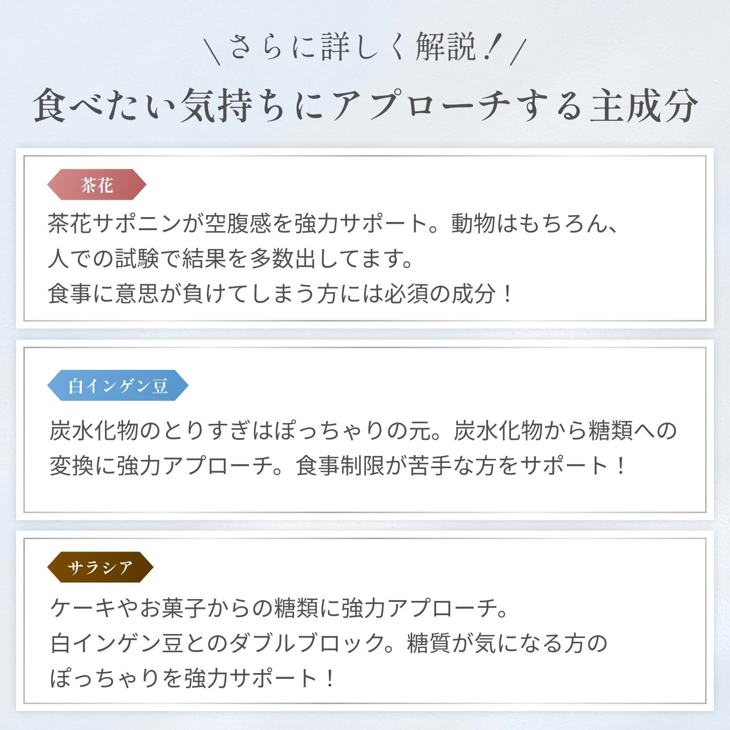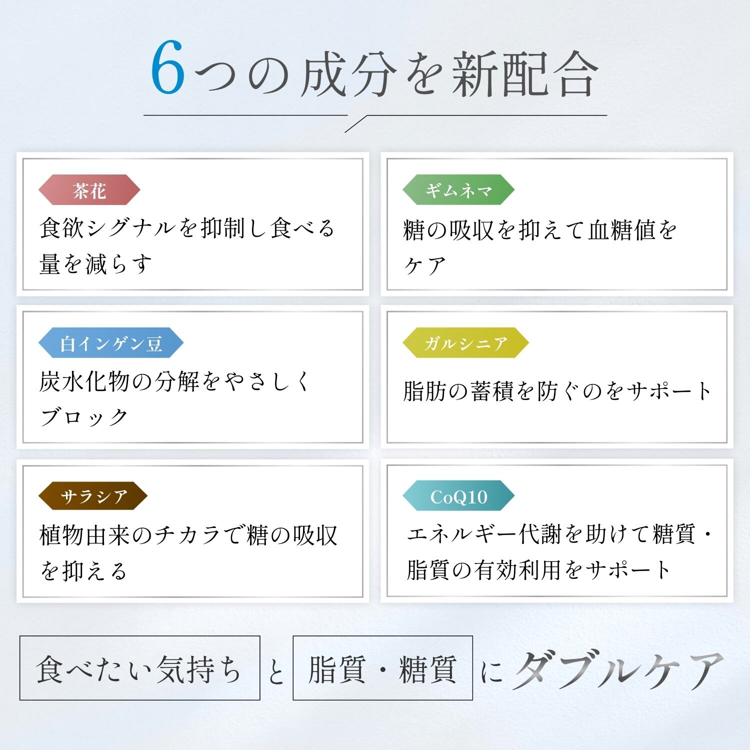 【サジェスト補助ワード】食欲抑制・食欲を抑える・茶花・白インゲン豆・サラシア・ガルシニア・ギムネマ・コエンザイムQ10・ダイエットサプリ・食べ過ぎケア・食欲ケア・糖質ケア・脂質ケア・健康サポート・美容サポート・ダイエット習慣